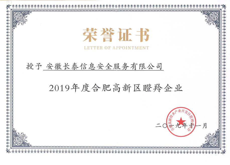 2019年,11月20日,合肥高新区2019年高成长企业榜单正式发布,高新区共认定了502家高成长企业,其中雏鹰企业275家、瞪羚培育企业72家、瞪羚企业149家、潜在独角兽企业3家、独角兽企业1家、平台型龙头企业2家。作为其中的高科技企业——安徽开云官方端网站登录入口-开云online(中国)成功入选瞪羚企业榜单。